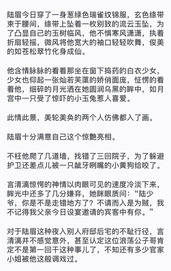 其实那些护卫们也是冤枉,因为这位陆小少爷别的不行,逃跑翻墙的功夫却是一liu,这也多亏了他爹陆大人从他十来岁起就拿着鞭条在后tou拼命追打他,他便发奋钻研了一本又一本轻shen功夫,学以致用,终于有了今日的造化。