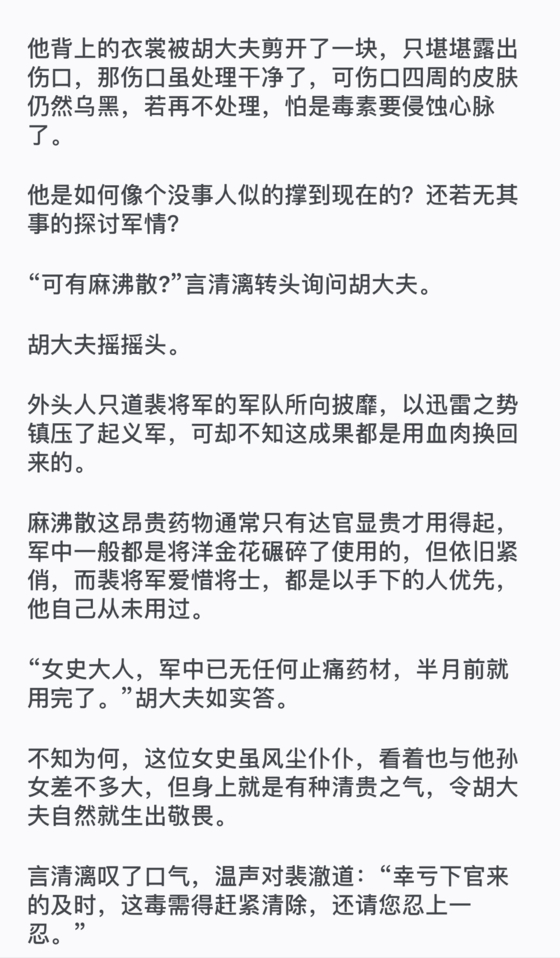 有两位也受了轻伤的副将退下了,铁衣和没大碍的dai参将,加上另外两名副将则因担心裴澈的伤势而留了下来。