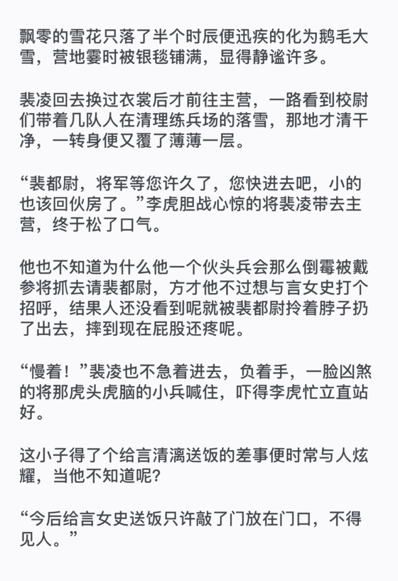 裴澈正与dai参将等人商议什麽,见他来了,便令众将下去休息。