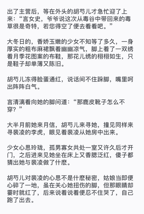 虽说胡芍儿平民女子的shen份,便是给裴凌zuo妾都gen本不可能,但有倾慕之人不是错,言清漓本想去安wei安wei,可想着以自己的立场去安wei反倒像是在炫耀,于是便只能叹息一声由她去了。
